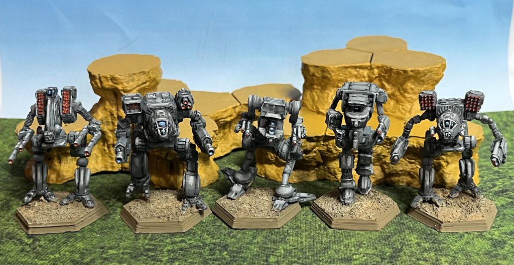 As I had already hinted at in my post about Clan Mech availability, I wanted to build and paint a typical Clan Wolf Star and ended up with two Timber Wolfs, one Stormcrow, one Mad Dog, and an Ice Ferret, to use the Clan names. One Timber Wolf is the new IWM A-config miniature, the others are the resculpts of approx. 20 years ago. Some of the molds are starting to show their age and have some mold lines. I’m also not the biggest fan of the Ice Ferret sculpt, which is somewhat difficult to pose and too large compared to the others.