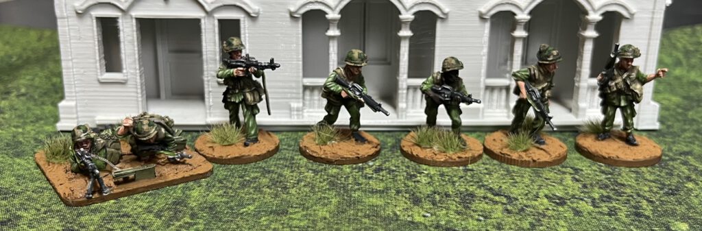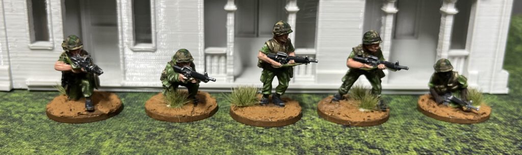 After procrastinating for years (literally), I’ve finally managed to finish 12 Empress Vietnam-era USMC miniatures. The paint recipe is described here. The Empress miniatures are very nice with realistic proportions, and go together well with the few Gringo 40s miniatures that I have finished earlier.